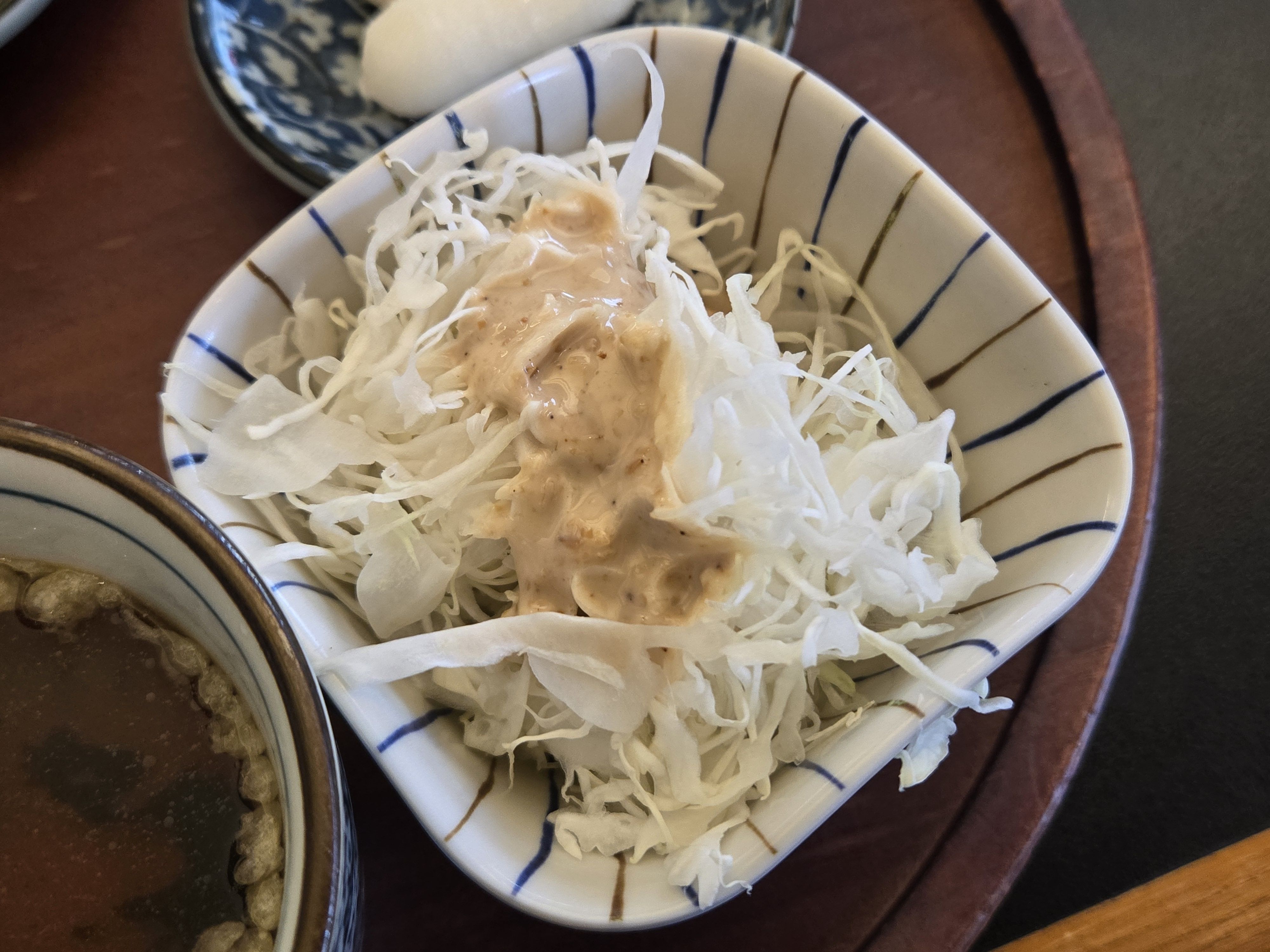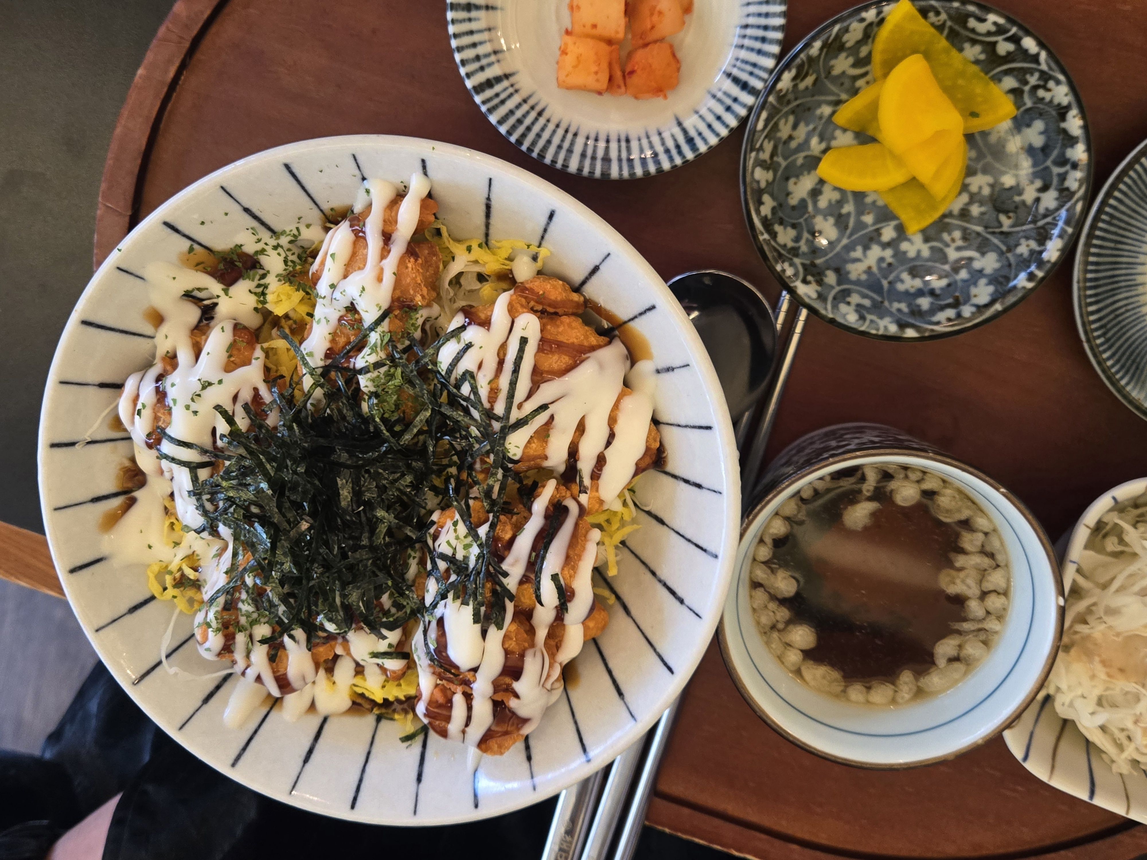 덮밥 옆에는 따뜻한 우동국물이 작은 그릇에 담겨 있었고 옆으로는 아삭한 양배추 샐러드, 떡, 단무지, 깍두기까지 깔끔하게 정돈되어 있었어요.