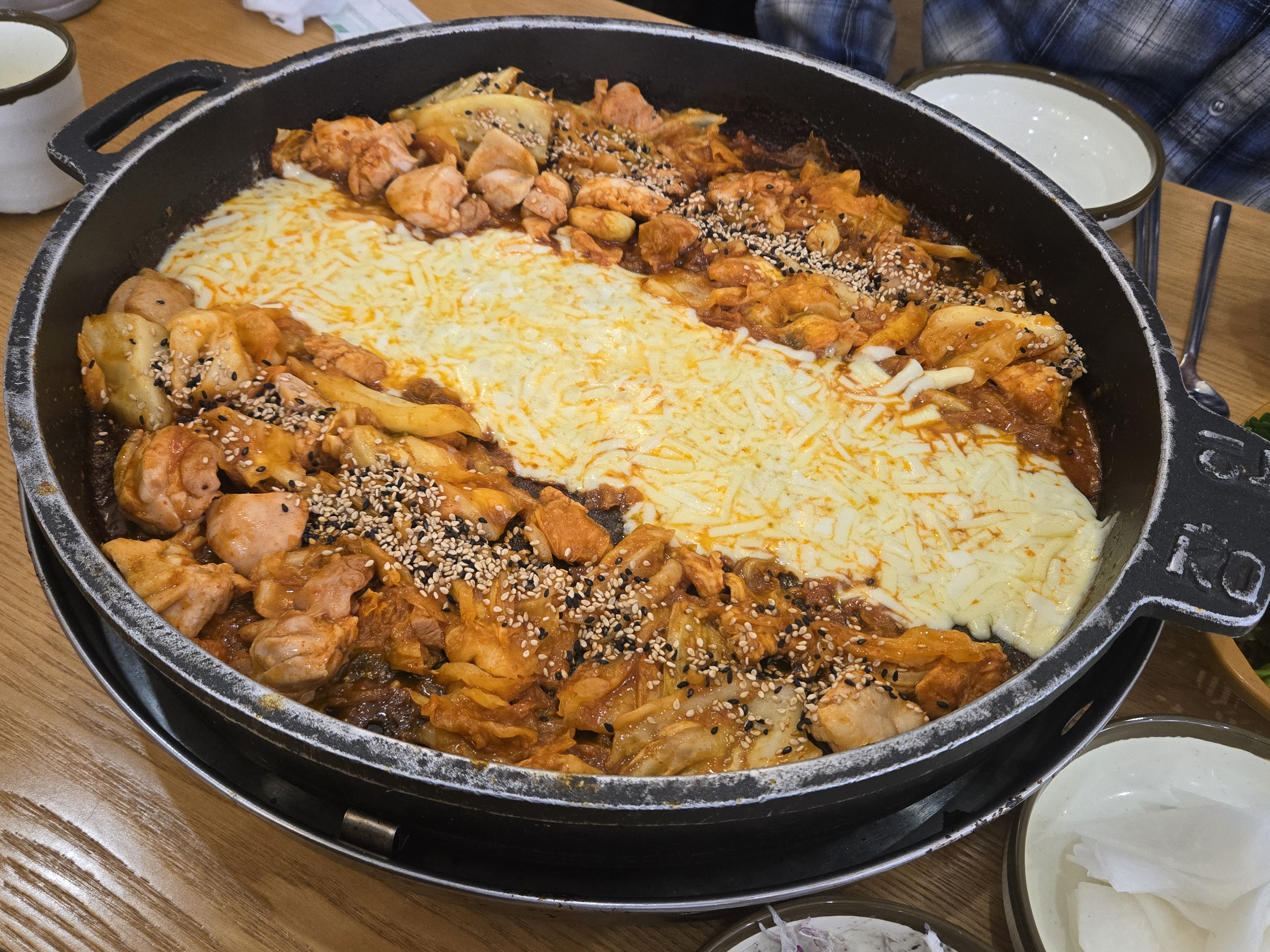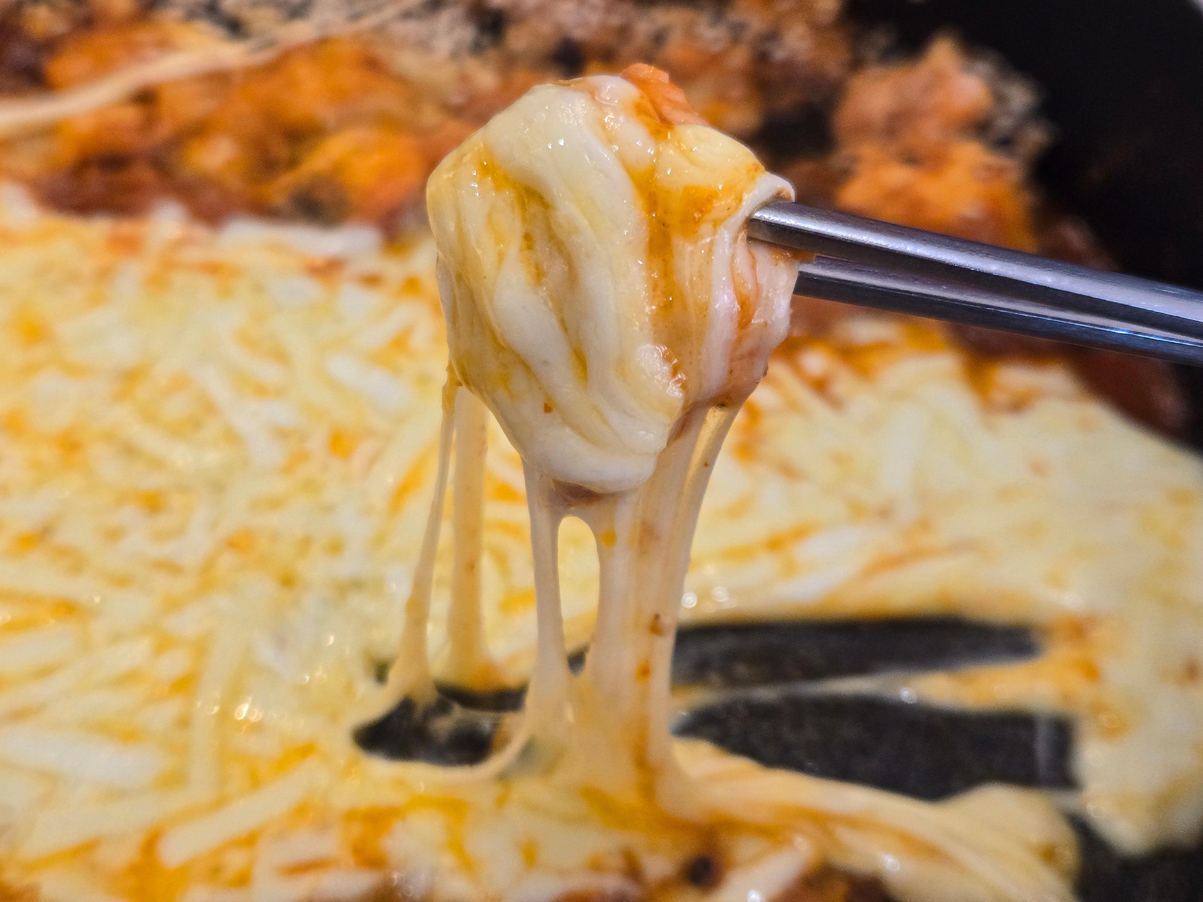 치즈가 녹으면서 부드럽게 늘어나 매콤한 닭갈비와 완벽하게 어울렸고 떡은 쫀득하고 고구마의 단맛이 양념과 잘 어우러졌어요.